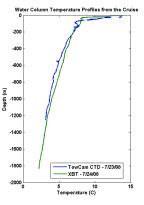A plot of the water column temperature from the CTD on the TowCam and the water column temperature from the XBT on July 24.