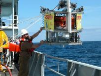 A close-up of the Towcam showing two of the bottles (grey) used to collect water samples from the water column.