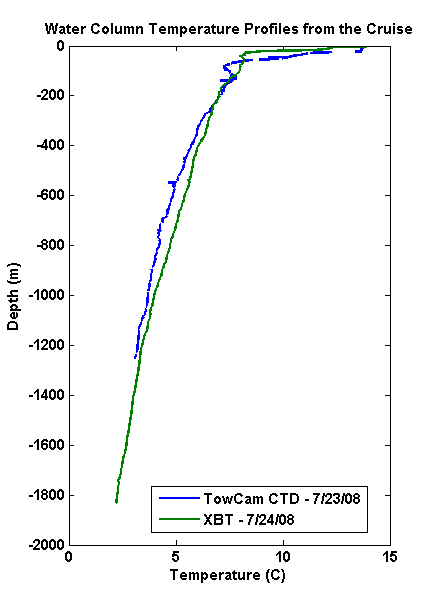 Title: A plot of the water column temperature from the CTD on the TowCam and the water column temperature from the XBT on July 24.