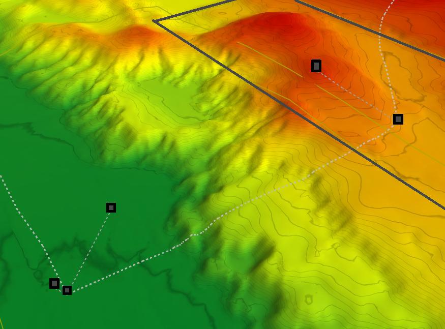 Hydrate Ridge (highlighted in red) on the continental shelf will be the site of secondary and experimental nodes on the Regional Scale Nodes. Power and communication connections will come from the primary node located on the flat lying abyssal plain to the west. The black lines outline the area surveyed using the EM300, prior to the Sentry and TowCam deployments. the white dotted lines indicate likely cable routes.