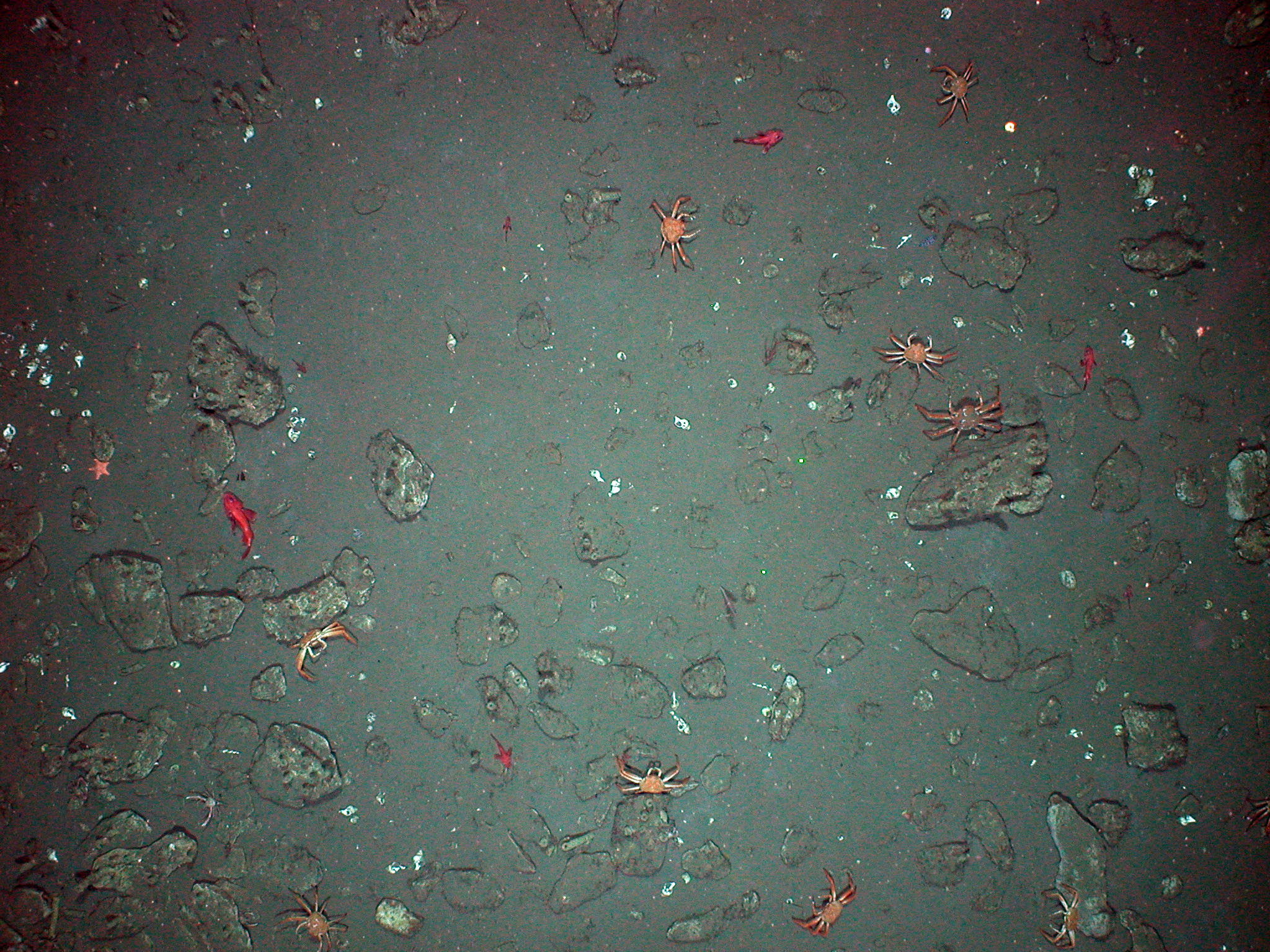 Fish, crabs, and snail and clam shells near the Hydrate Ridge methane seep. Image taken by TowCam.