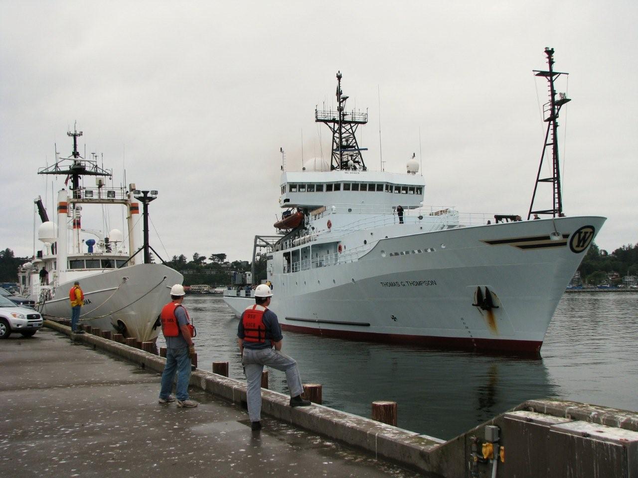 R/V Thompson docking in Newport, Oregon, forward of Oregon State University's R/V Wecoma