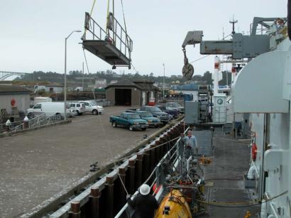 The gangway is taken aboard just before the Thompson departs Newport Oregon