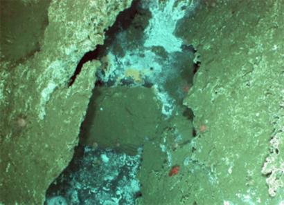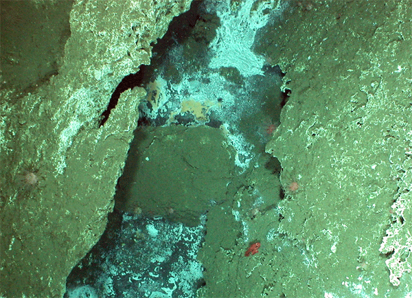 Orange and white mats of bacteria called Beggiatoa line seeps in fractured limestone at the Pinnacle deposit on Southern Hydrate Ridge at a water depth of ~780 m. Also seen are red fish called Thorny Heads, and scattered pink Octo Corals on the hard substrate.
