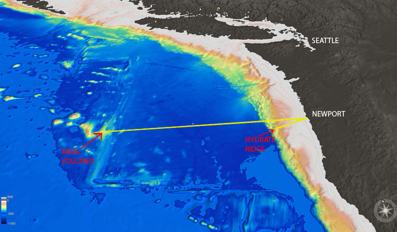 R/V Thompson's transit from Hydrate Ridge to a port of call in Newport, OR and then onto Axial Volcano.