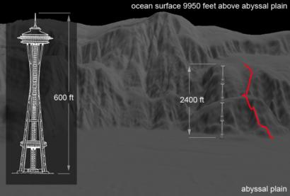 A rendering of the “tectonic front” that represents the build up of sediments on the edge of the North American continent. The point of view is from the deep, flat abyssal plain that is underlain by the Juan de Fuca tectonic plate. The TowCam trackline (shown in red) begins at 2911 meters water depth on the abyssal plain and terminates at 2160 meters water depth. Put in another perspective, Hydrate Ridge measures four Space Needles tall.