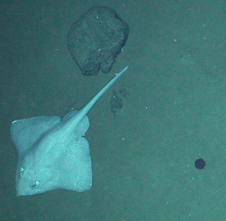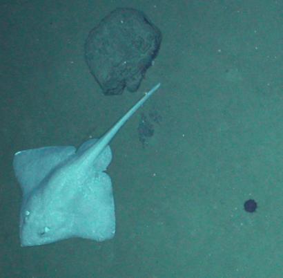 A skate, a few meters in length, swims close to the seafloor on Axial Seamount. TowCam #12