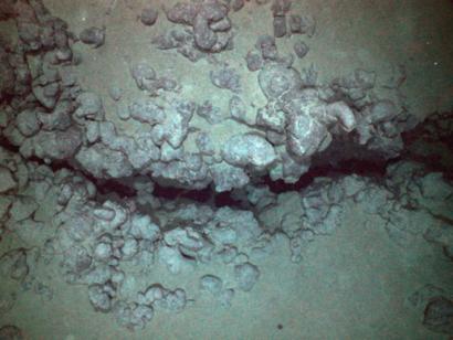 A fissure, ~ 3/4 of a meter across is bounded by pillow basalts interspersed with thick sediment ponds. TowCam#12