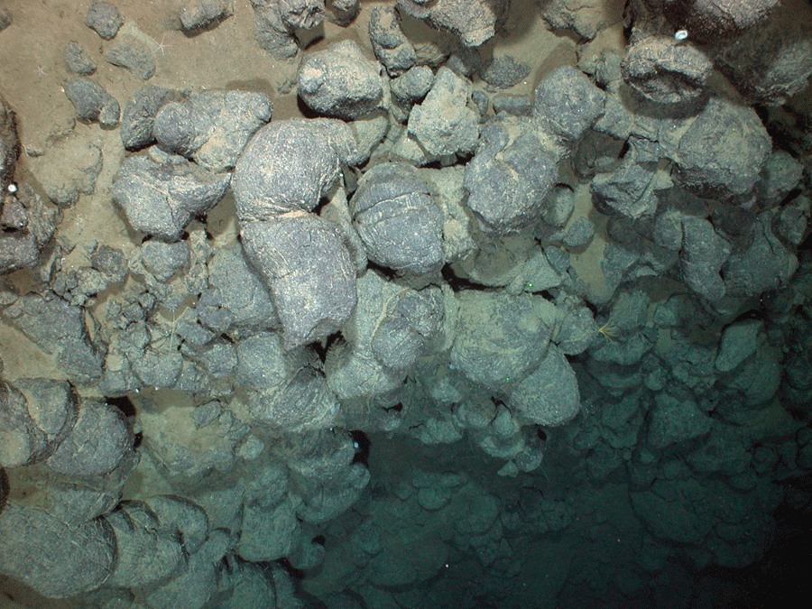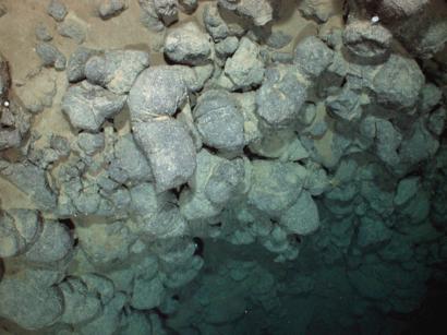 The edge of a pillow flow is intermixed with sediment on the eastern flank of Axial Seamount. TowCam #12.