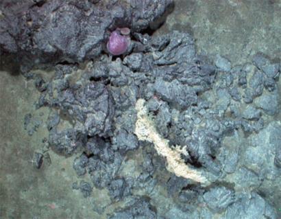 A small octopus clings to the side of a basalt flow on Axial Seamount. TowCam#13
