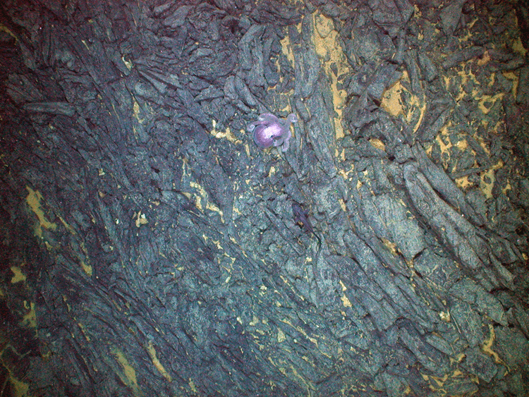 A small octopus glides across a pile of basaltic rubble in the caldera of Axial Seamount. Taken during TowCam #14.